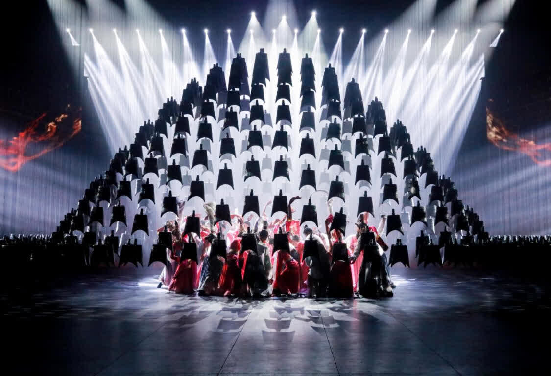 身著漢服,嬌美婀娜的舞者,伴著鏗鏘悠遠的編鐘,奮袖低昂,頓足起舞……大型演藝劇場《楚樂》帶觀眾近距離觸摸楚文化的脈搏。炫麗的舞臺上,鐳射燈、光束燈、圖案燈等不同形態、明暗、色彩的燈光,恍若看不見的手,在有限舞臺構建無垠時空,觀眾們跟隨光的指引,移步易景。由一千個編鐘組成的巨型編鐘列陣似波浪、似潮水,波瀾起伏,氣勢恢宏。在20余分鐘的表演里,《楚樂》將高科技與真人表演完美結合,唯美的布景和絢爛的聲光特效交相呼應,把荊楚文化的精髓和歷史向觀眾娓娓道來。