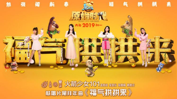 1月16日,新生代女子團體火箭少女101與最強口碑賀歲動畫電影《熊出沒?原始時代》強強聯合,由火箭少女101成員孟美岐、吳宣儀、段奧娟、賴美云合體獻聲的電影片尾曲《福氣拱拱來》在酷狗音樂正式上線??椿鸺倥畮ьI大家一起元氣滿滿喜迎2019新年到!火箭少女101的這首..