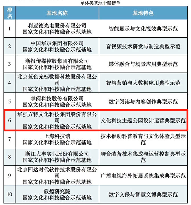 近日,中國人民大學創意產業技術研究院、文化品牌評測技術文化和旅游部重點實驗室在2019中國(南京)文化和科技融合成果展覽交易會上發布了“國家文化和科技融合示范基地十強榜單”。華強方特憑借在大型文化科技主題樂園設計與運營領域取得的突出成果,成功入選國家文化和科技融合示范基地單體類十強,同時也是唯一一家入選單體類十強的廣東企業。