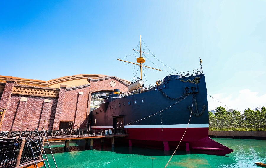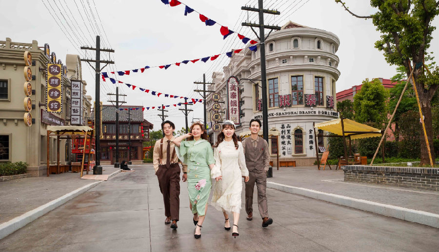 從刷著“十萬工農(nóng)下吉安”紅軍宣傳標(biāo)語的瑞金街,到設(shè)有“東商洋貨”和“寶麗唱片行”的“十里洋場”上海街,方特東方欲曉通過大量的仿古建筑、布景,打造了多個還原近現(xiàn)代中國不同時期的社會風(fēng)貌和人文風(fēng)情的主題街區(qū)、小鎮(zhèn),營造重回歷史的氛圍。