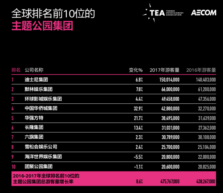 全球排名前十的主題樂園集團;來源:2017年全球主題樂園調查報告,TEA&AECOM