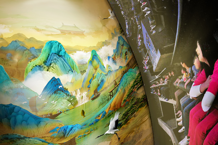 其中,最受廣大教師歡迎的項目當屬華強方特最新的匠心巨作《飛越千里江山》,該項目以國寶《千里江山圖》為藍本,通過方特獨創(chuàng)“飛行觀畫”模式,在4K分辨率的巨型高清球幕前,游客仿佛“飛入”畫中,身臨其境領(lǐng)略北宋傳世名畫的風采。全新的視角與逼真的畫面,短短幾分鐘的體驗讓老師們大呼過癮。