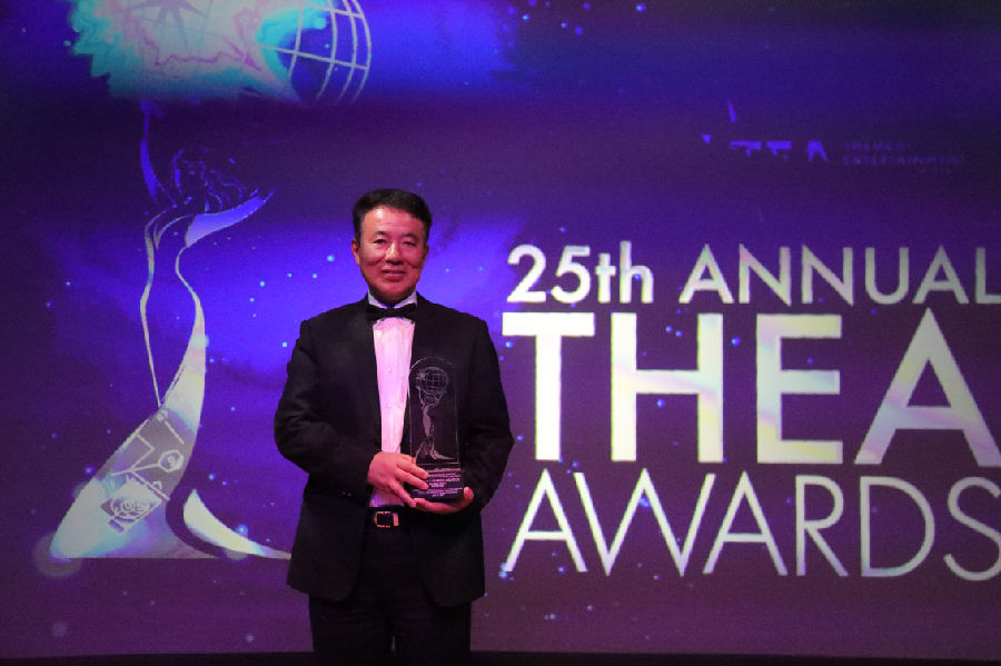 在活動的高潮時刻——“Thea頒獎晚會”上,全球主題娛樂業(yè)界的最佳行業(yè)巨星、創(chuàng)意科技先鋒以及國際領(lǐng)先的頂尖項目成為主角。李明先生現(xiàn)場領(lǐng)取了“方特東方神畫”的“杰出貢獻獎”,并在隨后發(fā)表感言時分享了“方特東方神畫”的創(chuàng)作初衷。李明表示,方特期望用頂尖的科技來展示中國文化、傳播中國文化,所以創(chuàng)意研發(fā)了“美麗中國”三部曲,向游客精彩呈現(xiàn)中國的過去、現(xiàn)在和未來。