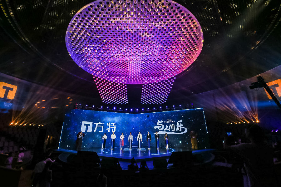 此后,方特品牌煥新儀式隆重舉行。劉道強與眾多嘉賓,以及方特員工及家屬代表、游客代表等,共同登臺點亮儀式啟動球,此時背景屏幕上閃耀的游客笑臉匯聚成“與人同樂”,凸顯歡樂與互動的氛圍。期間,舞臺上空的程控矩陣球緩緩下降,呈現方特LOGO的“T”字造型,巧妙傳達方特“文化+科技”的發展理念。