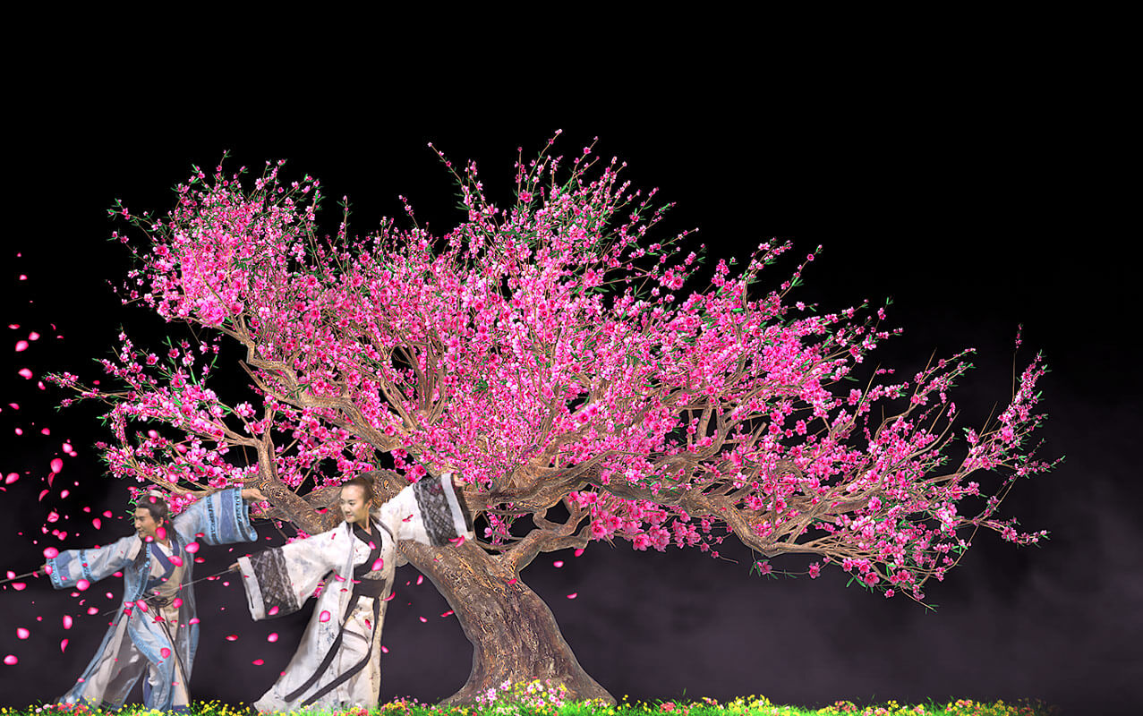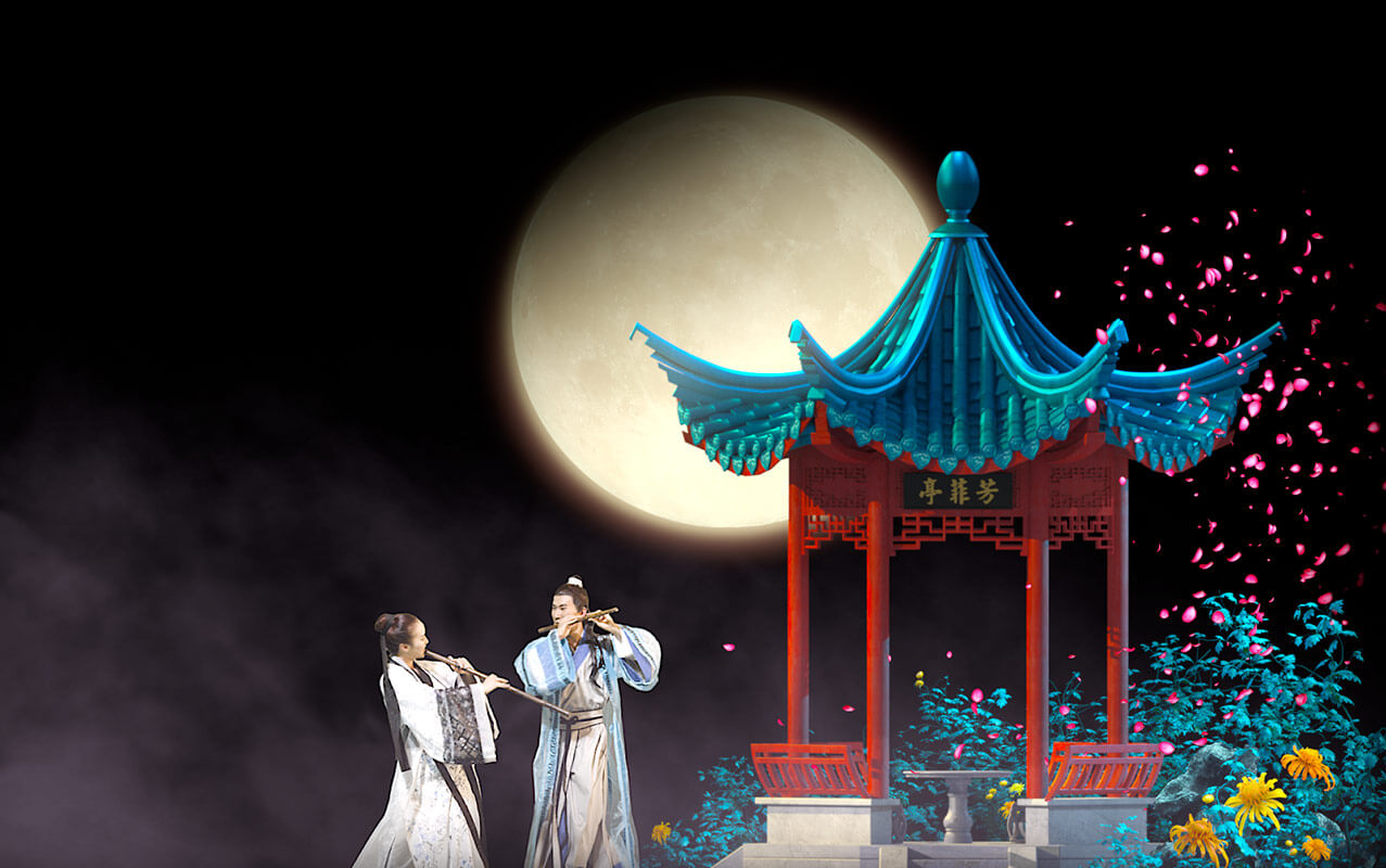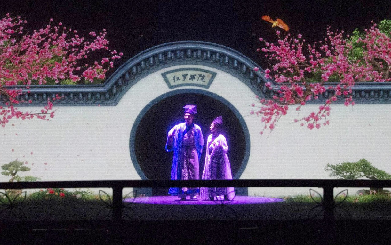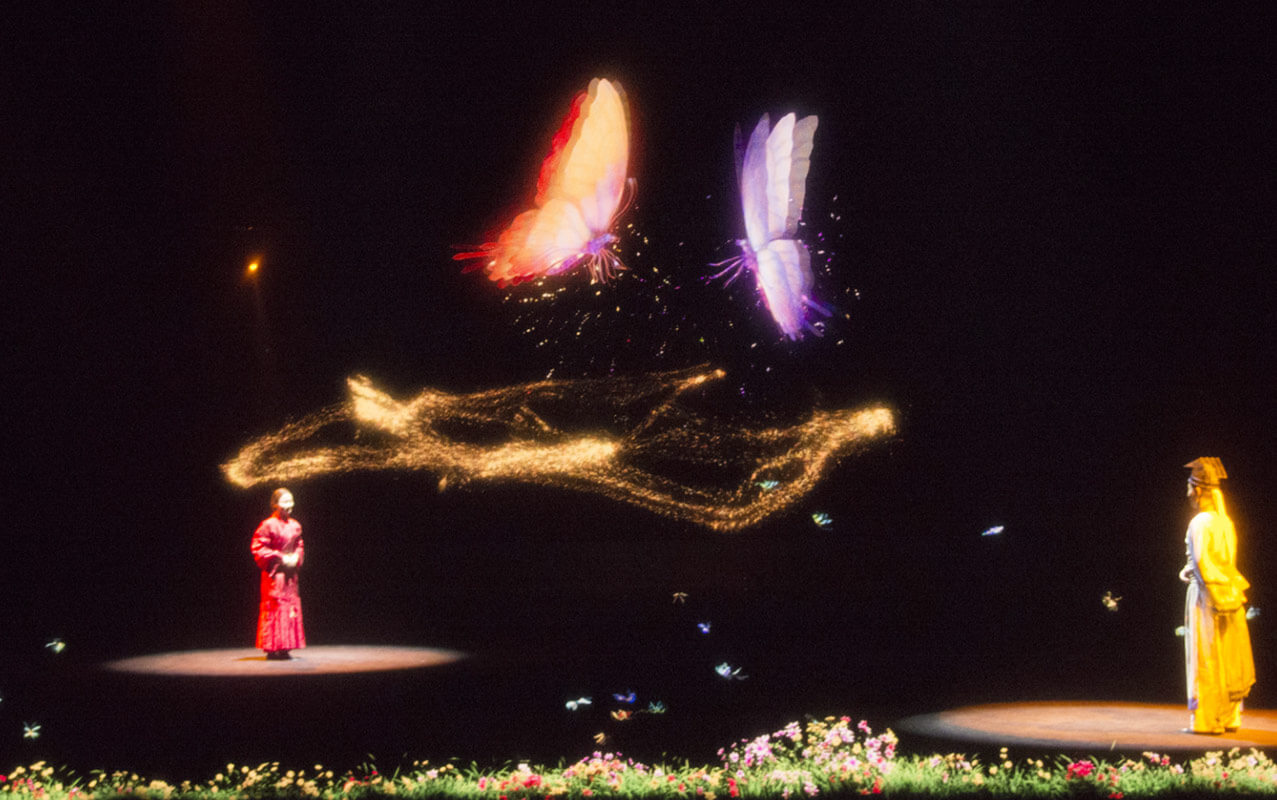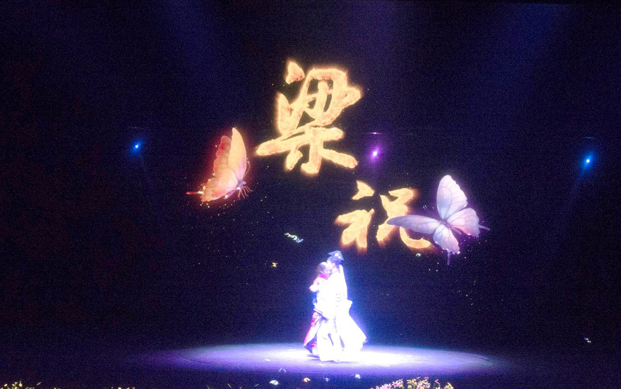 全景式AR環(huán)境影片《梁祝》,打破傳統(tǒng)歌舞劇場(chǎng)的表演形式,把真人表演與幻影成像相結(jié)合。以《梁山伯與祝英臺(tái)》的愛情故事為基礎(chǔ),精彩演繹祝英臺(tái)女扮男裝上山求學(xué),與梁山伯暗生情愫,最后為追尋真愛而殉情,兩人雙雙化蝶的經(jīng)典橋段 。實(shí)現(xiàn)了四面墻在通透的舞臺(tái)上憑空出現(xiàn),藤蔓在墻上生長(zhǎng),以及墻面碎裂、崩塌甚至消失等神奇效果。